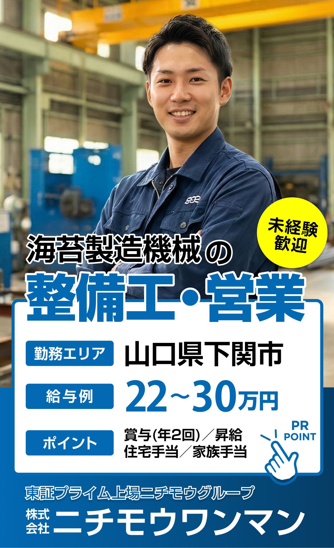 当面は、機械の知識を習得するため、組立や整備、メンテナンス業務に従事していただきます。 習熟後は「技術営業職」として、中国・四国地区の既存顧客を中心としたルート営業を担当していただきます。 ・全自動海苔乾燥機および周辺機器の製造 ・製品のアフターメンテナンス ・機械知識習得後の技術営業(ルートセールス) ※社用車(AT車・MT車)を使用します。 |