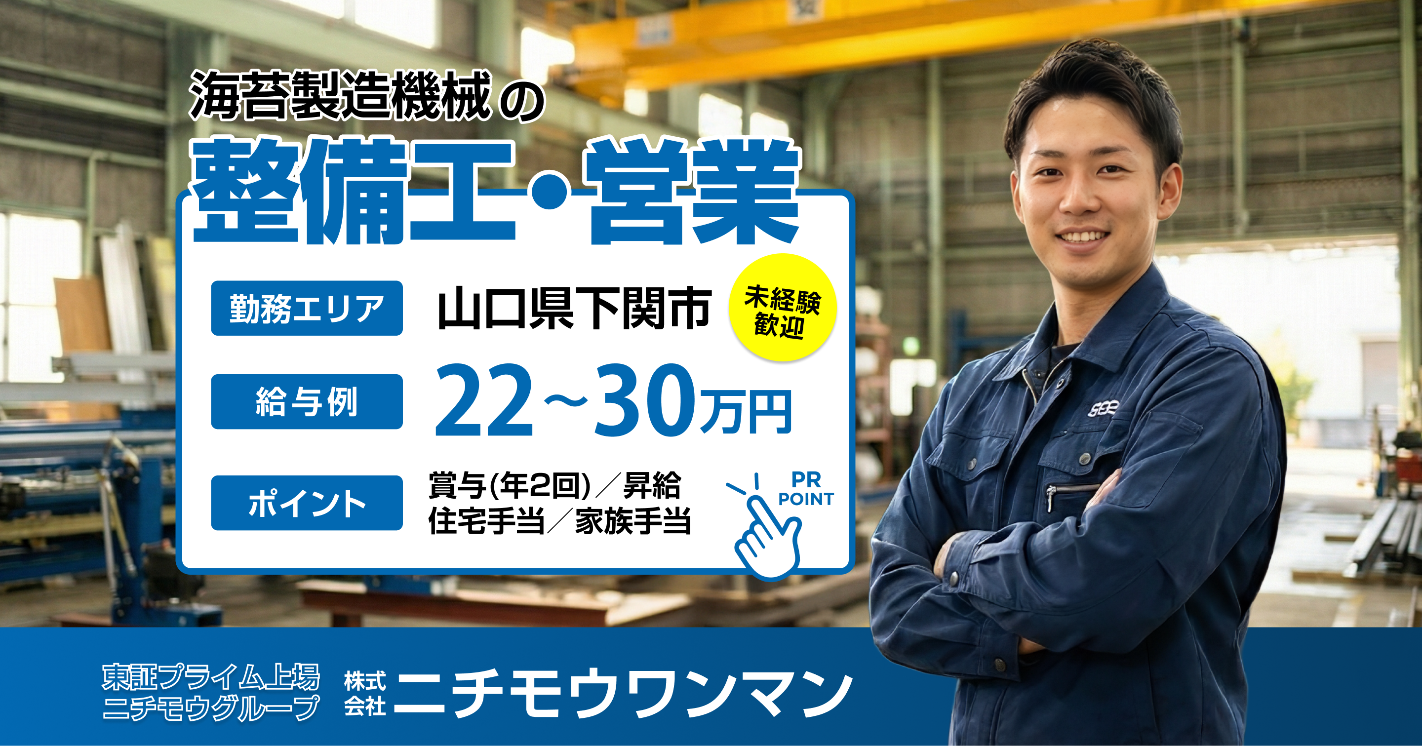 当面は、機械の知識を習得するため、組立や整備、メンテナンス業務に従事していただきます。 習熟後は「技術営業職」として、中国・四国地区の既存顧客を中心としたルート営業を担当していただきます。 ・全自動海苔乾燥機および周辺機器の製造 ・製品のアフターメンテナンス ・機械知識習得後の技術営業(ルートセールス) ※社用車(AT車・MT車)を使用します。 |